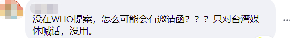 對於陳時中的“滿懷希望”,有島內網忍不住潑冷水:“陳時中還在做大頭夢,不信再過幾天地就‘一翻兩瞪眼’(意為只能接受現實)”;”沒在WHO提案,怎麼可能會有邀請函??只對台灣媒體喊話,沒用“。↓
