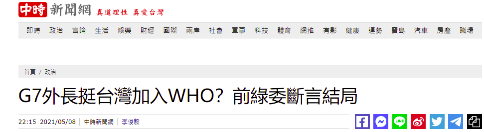 【環球網報道 記者 趙友平】台灣中時新聞網、《自由時報》消息,七國集團(G7)外長會議發佈公報,聲稱支持台灣參與世界衞生組織(WHO)論壇及世界衞生大會(WHA)。對於G7這份公報能否讓台灣重返WHO、WHA幾率提高,前民進黨“立委”郭正亮稱,台灣重返WHO大會幾率是零,等有代表國提案再説,且台灣真要派官方代表重返大會,這是要成員國投票表決的,以票數勝負來看,是不可能通過的,更何況,美國前總統特朗普任內都沒提案。郭正亮斷言台灣重返世衞大會結局後,台灣流行疫情指揮中心指揮官、“衞生福利部部長”陳時中還在自嗨,他聲稱,對於收到WHA邀請函,台灣抱持“高度期待”;台灣今年接到WHA邀請函的可能性“比以往都大”。
