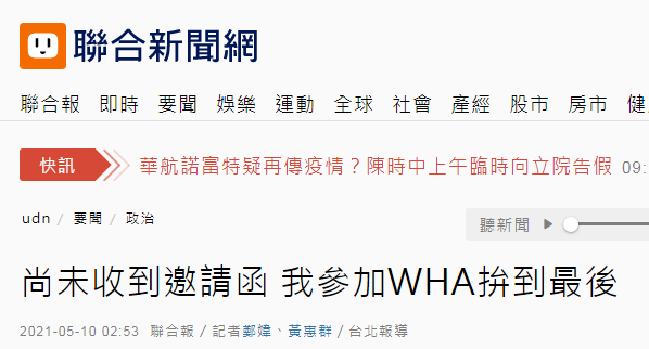 台灣親綠的《自由時報》10日提到,若台灣今年最後也未能獲邀參加,將是自2017年至今,第五度被WHO拒於門外。