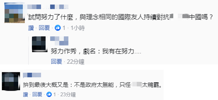 對於台外事部門的表態,有島內網友忍不住吐槽,在台媒評論區留言質問,“試問努力了什麼?”隨後有網友附和稱,“努力作秀”,網友似乎預料到民進黨當局的套路,到最後打“悲情牌”,“拼到最後大概又是:不是政府太無能,只怪大陸太鴨霸。”