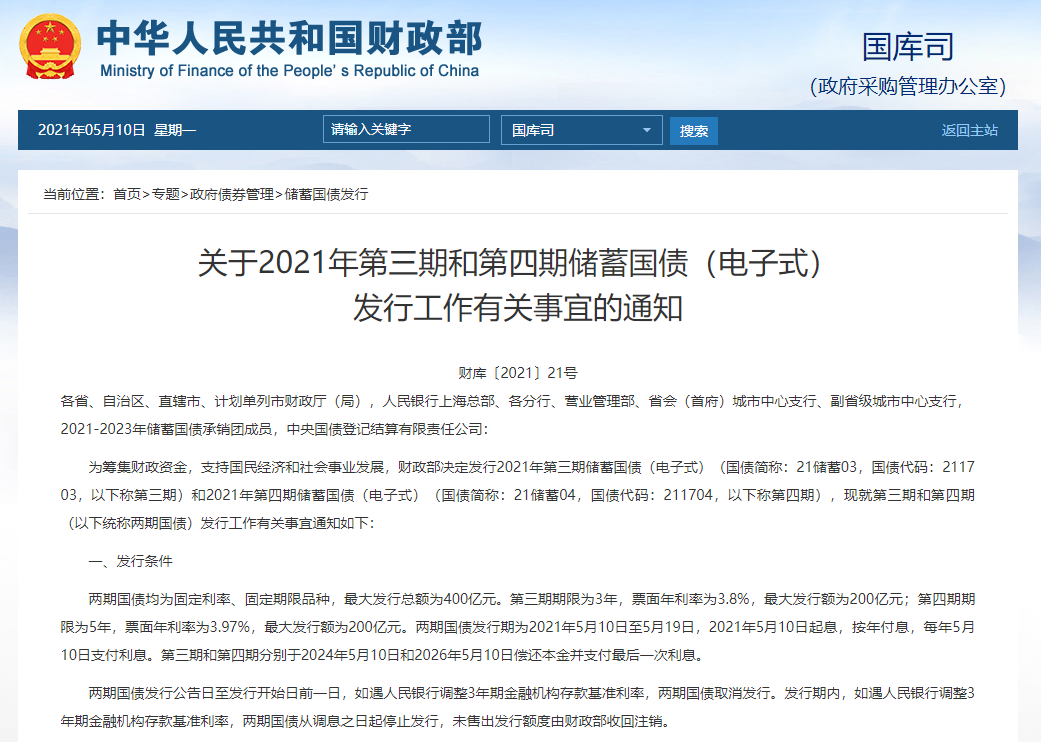 據財政部發布的“關於2021年第三期和第四期儲蓄國債(電子式)發行工作有關事宜的通知”,兩期國債最大發行總額為400億元,均為固定利率、固定期限品種。第三期期限為3年,票面年利率為3.8%,最大發行額為200億元;第四期期限為5年,票面年利率為3.97%,最大發行額為200億元。