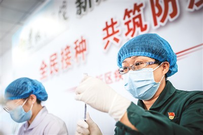 “五一”假期期間,遼寧省瀋陽市沈北新區疫苗接種工作不放鬆,接種方艙持續接種。圖為5月5日,醫護人員準備為市民接種疫苗。
