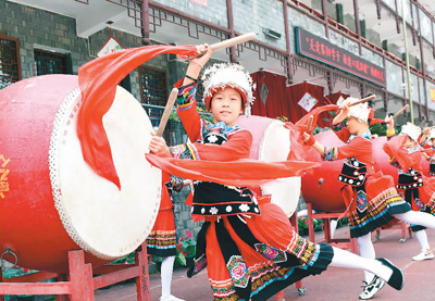 “五一”假期,湖南省湘西土家族苗族自治州吉首市寨陽小學為苗家留守兒童提供活動場所和義務輔導服務,讓孩子們開展習苗鼓、吹嗩吶及分享紅色故事等有益活動,歡歡樂樂度假期。圖為5月5日,苗家娃在打苗鼓。