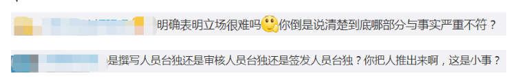 有網友問,“明確表明立場很難嗎,你倒是説清楚到底哪部分與事實嚴重不符?”“是撰寫人員‘台獨’,還是審核人員‘台獨’,還是簽發人員‘台獨’?你把人推出來啊,這是小事?”↓