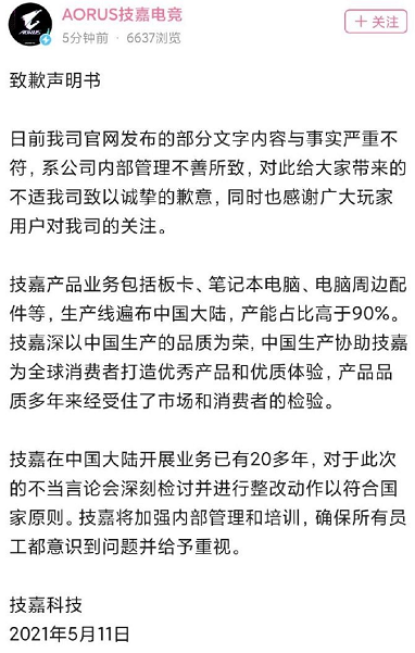 對於引發的質疑,技嘉科技11日中午發佈致歉聲明書,還稱技嘉以中國生產的品質為榮。以下為全文: