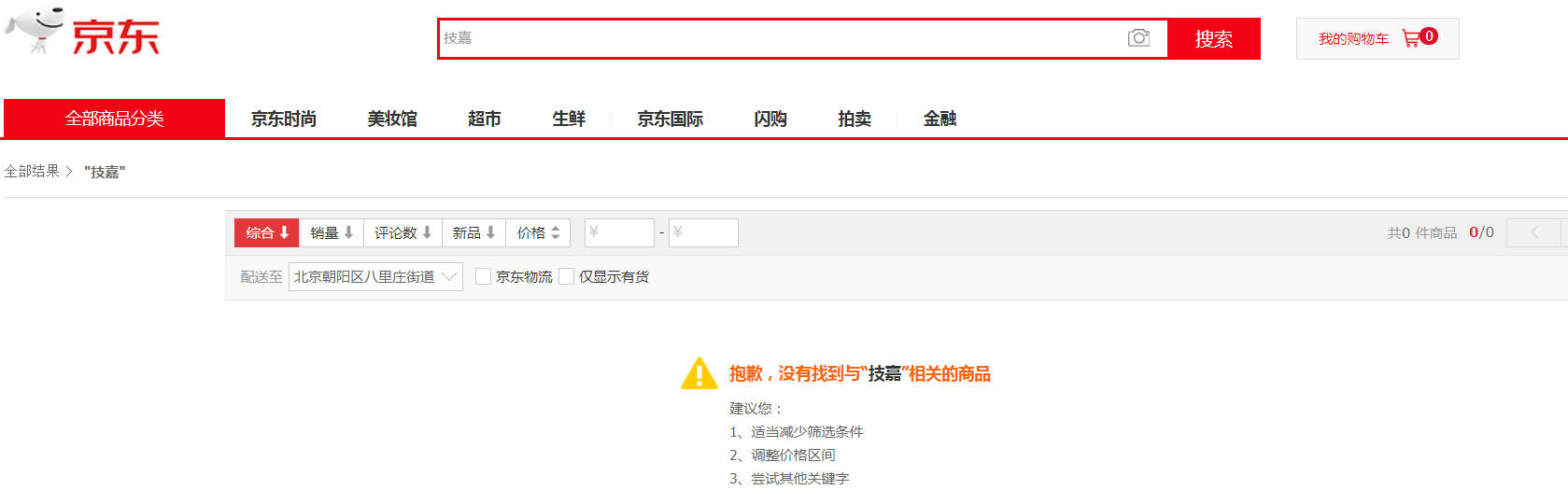 環球網記者剛剛在京東網上商城以關鍵字“技嘉”查詢,頁面顯示“抱歉,沒有找到與‘技嘉’相關的商品”。而上午,記者查詢時,京東還能搜到技嘉相關商品。