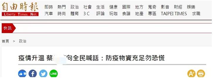 蔡英文還聲稱,目前台灣防疫物資和醫療系統充足,請台民眾放心,疫苗也會陸續到位,稱會協調相關“部會”和 地方政府共同強化防疫措施,她還稱更嚴格的防疫措施難免影響大家生活,也會讓大家擔心,但是請島內民眾不要恐慌,一起用最嚴謹的態度、最大的警覺,配合指揮中心的指引來防疫。