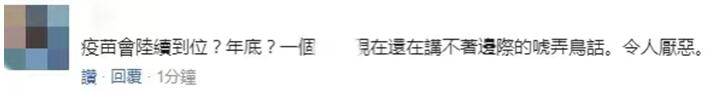 對於蔡英文的講話,不少島內民眾都提出了質疑,有島內網友問:疫苗會陸續到位?年底?一個領導人現在還在講不着邊際的糊弄話,令人厭惡。↓