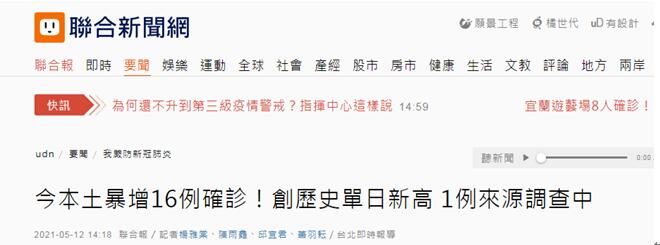 【環球網報道 記者趙友平】台灣“中央社”、“聯合新聞網”消息,台灣今天(12日)突增16例新冠肺炎本土病例,是否升到三級防疫警戒引發關注。台灣流行沒情指揮中心指揮官陳時中今天稱,本週共新增宜蘭、新北2起羣聚及數例感染源不明個案,還未達三級警戒標準。