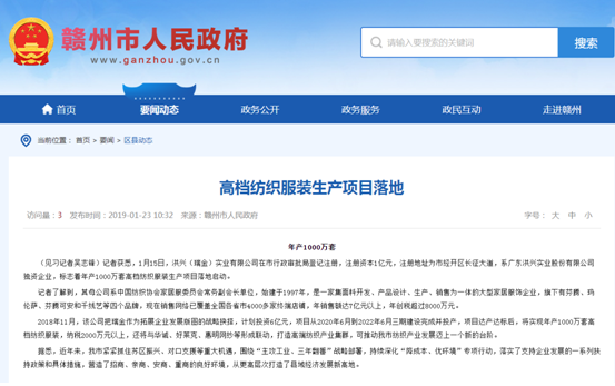 然而,贛州市人民政府官網2019年消息稱,2018年11月,洪興實業把瑞金作為拓展企業發展版圖的戰略抉擇,計劃投資6億元,項目從2020年6月到2022年6月三期建設完成並投產,項目達產達標後,將實現年產1000萬套高檔紡織服裝,納税2000萬元以上。瑞金網2020年9月,來源於國家級瑞金經濟技術開發區的公開新聞又稱,洪興實業年產1000萬套高檔紡織服裝項目預計2020年11月底建成投產,建成後一期項目用工約1000人,項目達產達標後可實現年度主營業務收入1億元以上,納税500萬元以上。