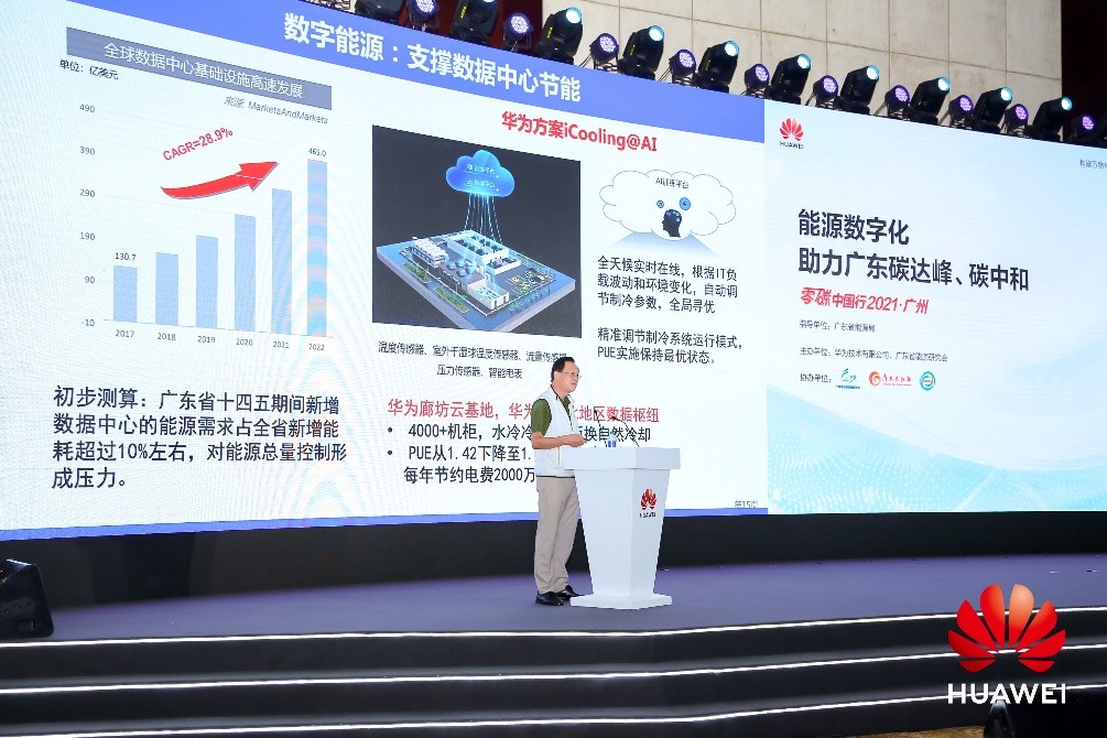 華為數字能源技術有限公司首席營銷官方良周強調,實現碳中和最核心的要素是低碳化、電氣化、智能化。華為數字能源,通過零碳全場景解決方案,包括零碳發電、零碳ICT能源、零碳出行以及零碳園區,持續助力廣東能源結構轉型、助力構建綠色ICT,使能行業減碳。
