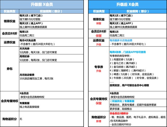 除了公眾日常較為歡迎的“會員日88折”、“領菜權益”依然保留之外,本次升級在運費和專享券上做了調整。以前每月4次的零門檻免運費權益,升級為每月31次。