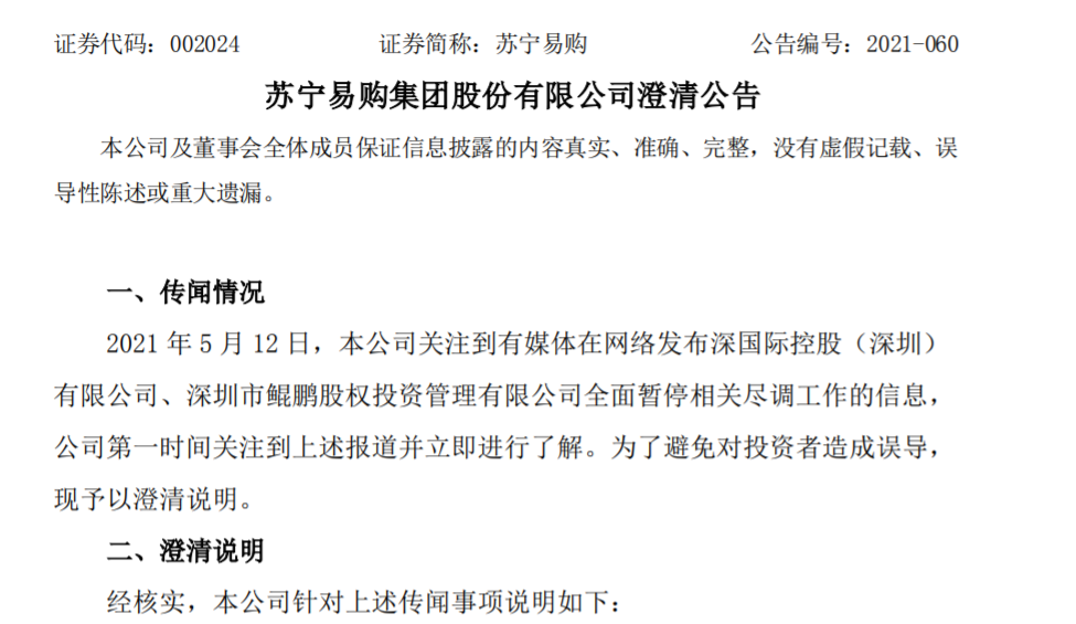 【環球網科技綜合報道】5月13日,蘇寧易購發佈公告稱,與深國際控股(深圳)有限公司、深圳市鯤鵬股權投資管理有限公司按照之前已簽署的《股份轉讓框架協議》正在進行正常的項目盡調工作,意味着公司引入戰略投資者工作正按部署正常推進。