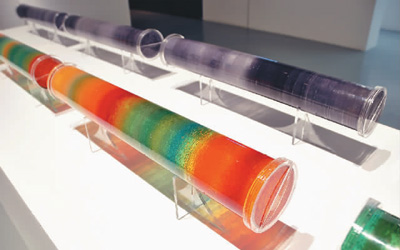 通過數據處理和轉換,關映日將冰芯反映温度變化和二氧化碳含量變化的數值轉變成色彩:彩色圓筒反映大氣温度變化,紅色代表温度高,藍色代表温度低;黑白圓筒反映二氧化碳含量變化,顏色越黑二氧化碳含量越高。“我希望觀眾看到這個作品,能直觀感受到全球氣候變化的過程,反思人類活動對全球氣候的影響。”他説。