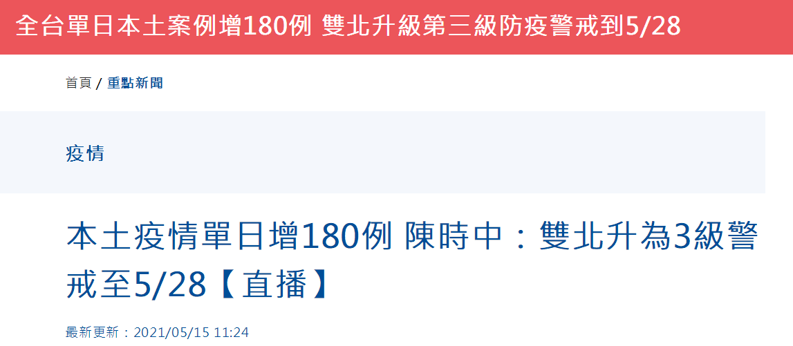 疫情大暴發!台媒:台昨天一天新增180個本土病例,台北、新北升為三級防疫警戒