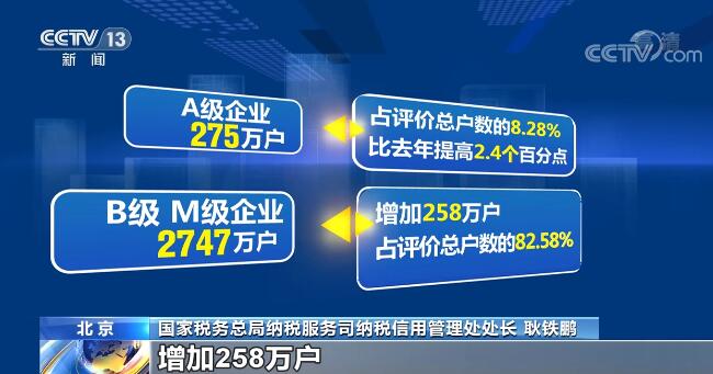 國家税務總局納税服務司納税信用管理處處長 耿鐵鵬: 這次納税信用評價結果,A級納税人的數量和佔比明顯上升,評出A級納税人275萬户,佔評價總户數的8.28%,佔比比去年提高了2.4個百分點;評出B級和M級企業共2747萬户,增加258萬户,佔評價總户數的82.58%。這説明廣大納税人依法誠信納税的意識和能力都在增強,也説明納税信用管理在社會信用體系建設中的作用也越來越突出。