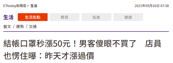 台灣疫情暴發引發搶購,口罩秒漲50新台幣,顧客傻眼店員也愣:昨天才漲過價!