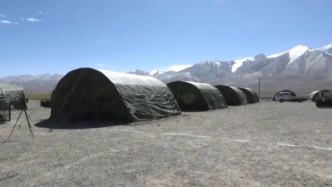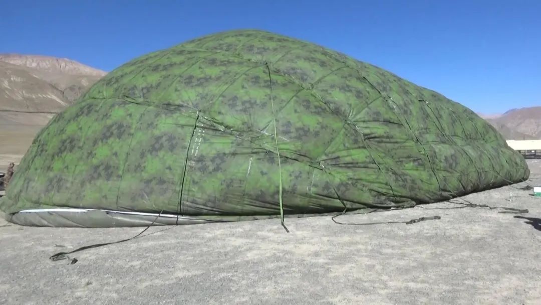 在海拔近5000米的高原,充氣型野營支援保障系統 進行試裝試用。該支援保障系統採用閉氣式拱形結構,包括指揮、維修、住宿、衞浴、就餐等11大模塊,並具有隱蔽與防偵視效果。