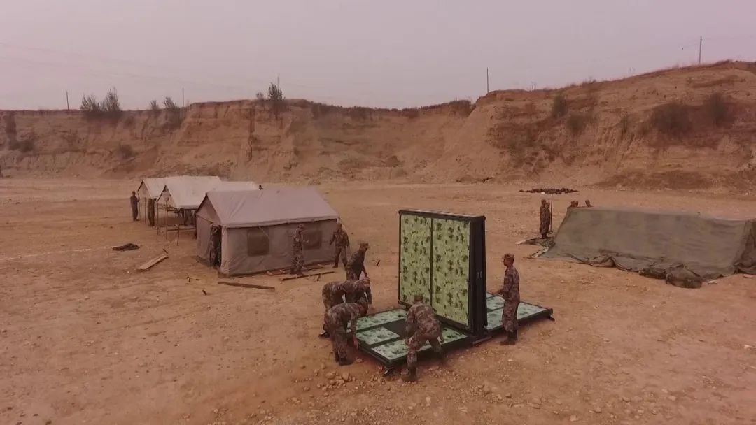 第82集團軍某合成旅正在進行拆裝式營房試點項目。官兵們在野外駐訓時搭建野戰摺疊營房 ,它的拆裝性很好,幾名戰士在15分鐘內就可以完成搭建。