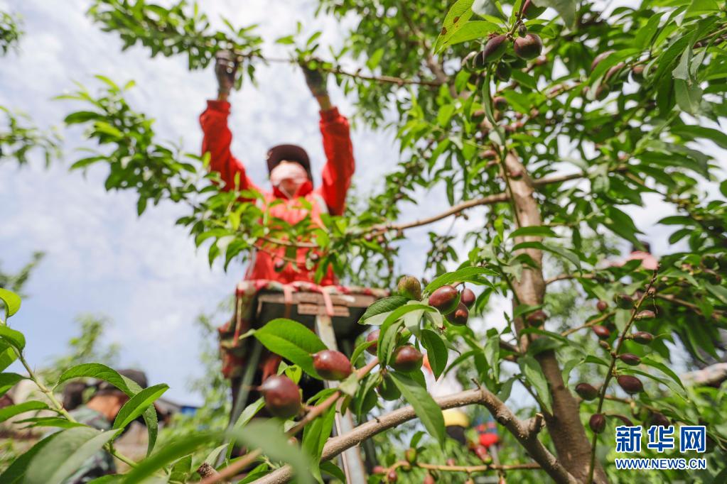 5月16日,河北唐山遵化市新店子鎮君子口村的農民在油桃果園疏果。初夏時節,各地農民抓緊農時,在田間插秧、施肥,或在大棚裏管護、收穫農作物,田間地頭呈現出一派繁忙景象。新華社發(劉滿倉 攝)