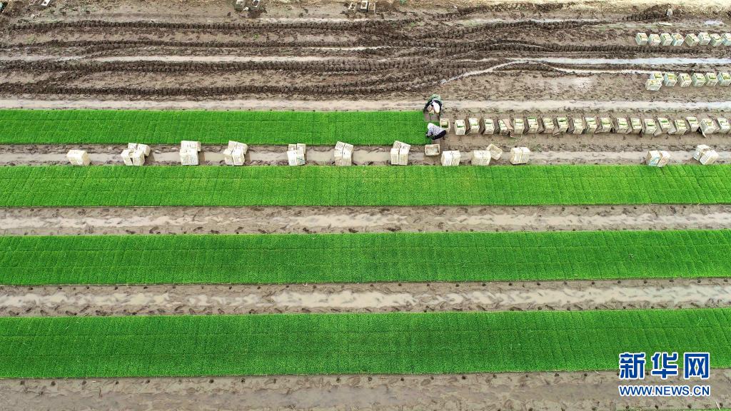 5月16日,河北省唐山海港經濟開發區王灘鎮農民在水稻育苗基地進行起秧作業(無人機照片)。初夏時節,各地農民抓緊農時,在田間插秧、施肥,或在大棚裏管護、收穫農作物,田間地頭呈現出一派繁忙景象。新華社發(李磊 攝)
