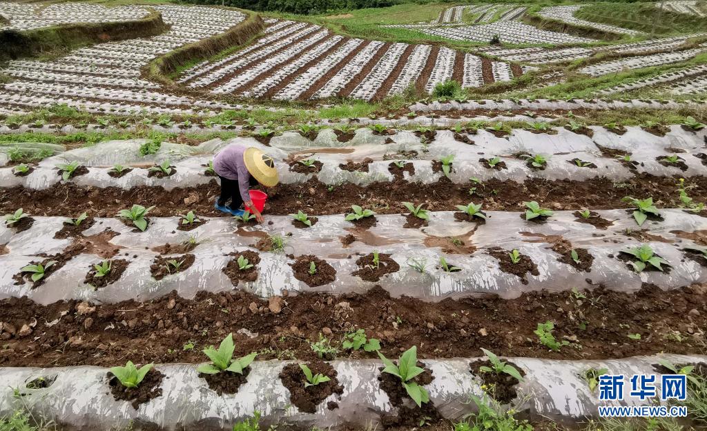 5月16日,在貴州省黔南布依族苗族自治州福泉市金山街道坪山村,村民為烤煙苗追肥培土。初夏時節,各地農民抓緊農時,在田間插秧、施肥,或在大棚裏管護、收穫農作物,田間地頭呈現出一派繁忙景象。新華社發(吳儒波 攝)
