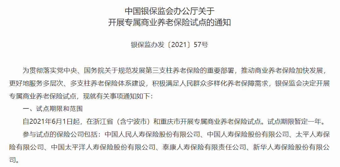 【環球網綜合報道】日前,銀保監會發布《關於開展專屬商業養老保險試點的通知》(下簡稱《通知》),6月1日起,在浙江省(含寧波市)和重慶市開展專屬商業養老保險試點,試點期限暫定一年。