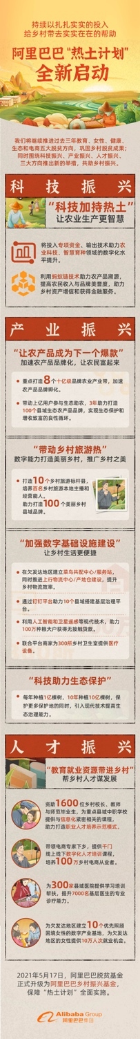 當日,“希望的熱土——2021阿里巴巴鄉村致富大會”在甘肅蘭州舉行。大會上,阿里巴巴宣佈:在繼續保持投入、鞏固鄉村脱貧成果的基礎上,接下來將更進一步,從科技振興、產業振興和人才振興三個方向推出助力鄉村振興的“熱土計劃”,並將“阿里巴巴脱貧基金”全面升級為“阿里巴巴鄉村振興基金”,全面保障“熱土計劃”各項舉措不折不扣,確保成效。