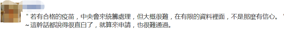 有網友看清陳時中面目:“若有合格的疫苗,‘中央’會統籌處理,但大概很難,在有限的數據裏面,不是那麼有信心。"~這幹話都説得很直白了,就算來申請,也很難通過。↓