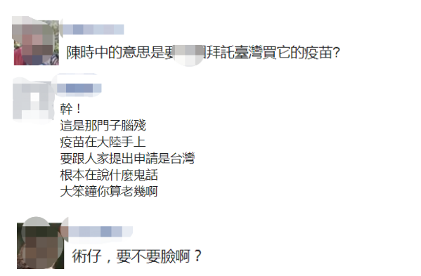 對陳時中18日相關言論,島內一些網友實在看不下去,留言斥責“這是哪門子腦殘?疫苗在大陸手上,要跟人家提出申請是台灣,根本在説什麼鬼話,大笨鐘你算老幾啊?”“要不要臉啊?”