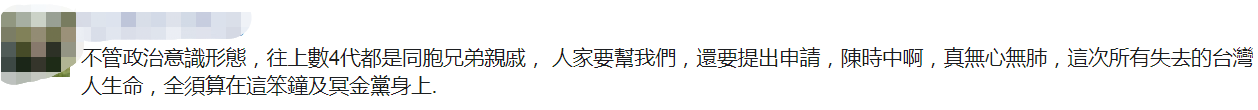 還有網友説,不管政治意識形態如何,往上數四代都是同胞兄弟、親戚, 人家要幫我們,還要提出申請,陳時中啊,真無心無肺,這次所有失去的台灣人生命,全須算在陳時中及民進黨身上。↓