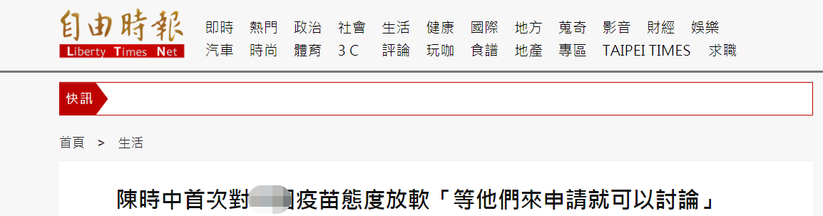 《自由時報》稱,疑似因疫情嚴峻,這是陳時中首度鬆口可以考慮中國(大陸)疫苗。對於大陸疫苗,陳時中過往態度一向是以“法規不允許”為由回絕,或是提出各項數據顯示大陸疫苗效力不好,接種後也無效,但這次是他首次以開放態度表示“若有申請可以研議”。