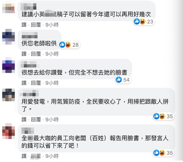 有網友諷刺:“建議小英稿子可以留着,今年還可以再用好幾次”, “用愛發電,用氣質防疫,全民要收心了,用掃把跟敵人拼了。”↓