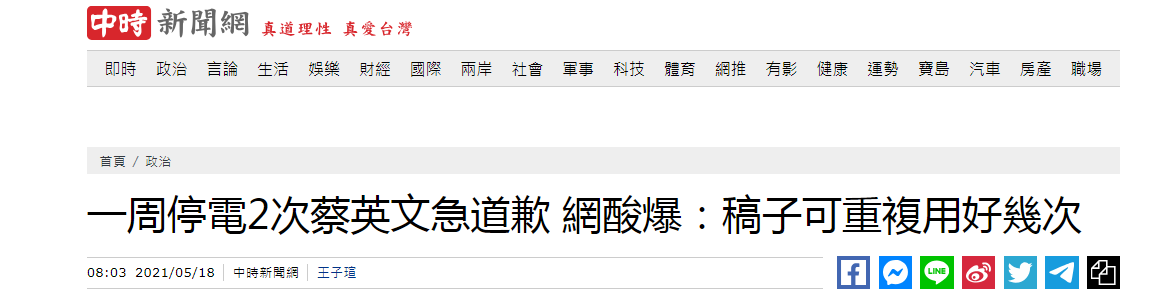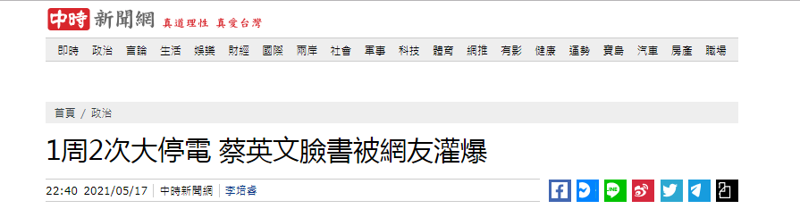 【環球網報道 記者 趙友平】禍不單行!島內疫情嚴峻,與此同時許多人在家防疫卻遭遇停電。台灣中時新聞網消息,台灣興達電廠5月13日才發生事故全廠停機,造成全台無預警大停電,不料17日晚間又出現全台多處地區停電,台北市逾10萬户民眾遭殃。台當局領導人蔡英文昨(17日)晚在臉書發文緊急道歉,不少網友看到帖文後,紛紛湧入蔡英文的臉書留言抗議,報道稱,蔡英文臉書被網友“灌爆”。有網友諷刺:“建議小英稿子可以留着,今年還可以再用好幾次。”