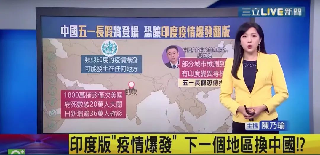 近日,中國台灣省的新冠肺炎疫情突然呈現暴發趨勢,全台疫情防控形勢危急。而一則台灣省綠媒“三立電視台”於4月30日播出的節目也隨之被網友們扒出。在節目中,三立電視台預言稱,印度版的“疫情大暴發”恐怕還要上演,而這一次大暴發的地區有可能在中國。
