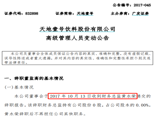 不僅如此,根據新三板掛牌公司天地壹號在2017年10月發佈的《高級管理人員變動公告》,其中披露黃水榮先生是在2017年10月13日遞交的辭職報告,這也與招股書中披露的黃水榮先生在天地壹號任職至2017年9月的信息不符。