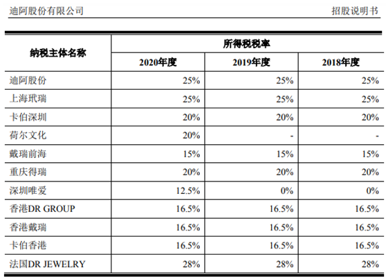 但是根據招股書披露的税率信息,迪阿股份的子公司中,僅有上海玳瑞的所得税率為25%、法國子公司税率為28%,其餘子公司的所得税率都在20%以下;而且這兩家子公司2020年的淨利潤分別為677.60萬元和-297.64萬元,即便是盈利狀態下的上海玳瑞利潤貢獻在子公司合計數中的佔比也並不高。子公司中2020年實現淨利潤最高的是“深圳戴瑞前海商業管理服務有限公司”,金額高達1.61億元,而這家子公司的所得税率僅為15%