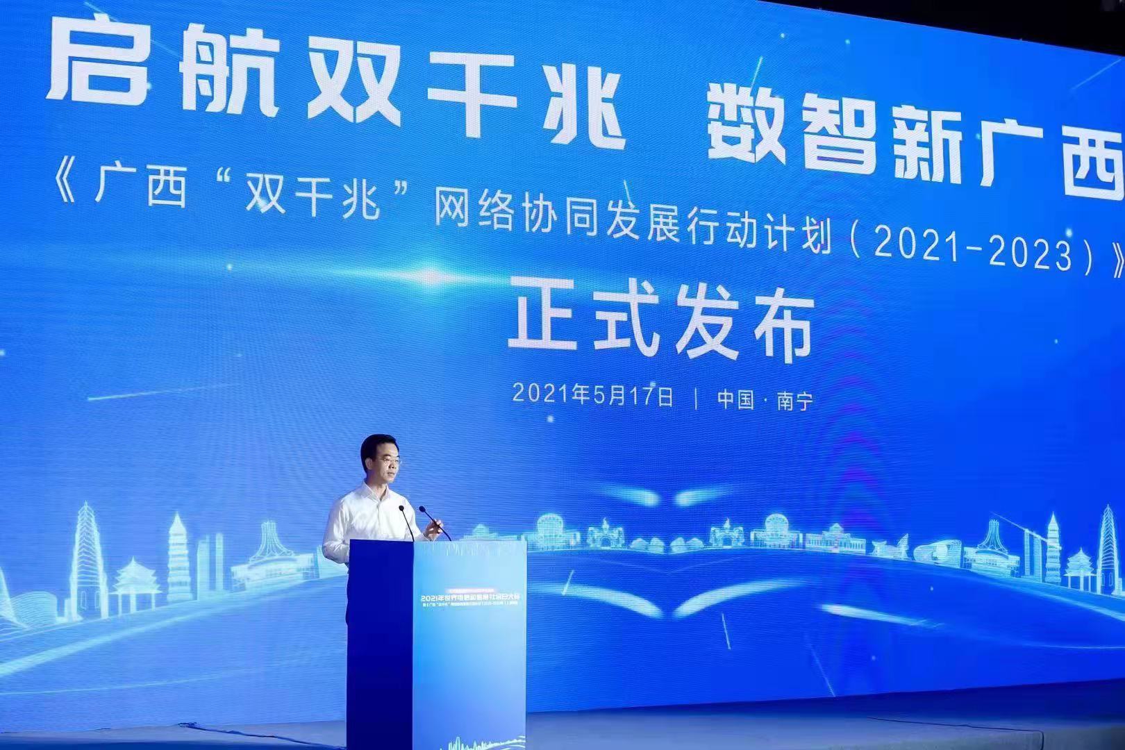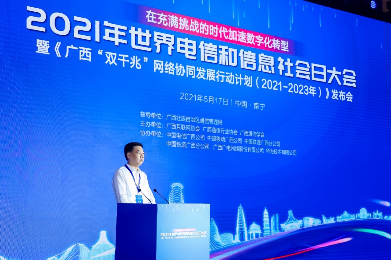 在當天召開的2021年世界電信和信息社會日大會暨《廣西“雙千兆”網絡協同發展行動計劃(2021-2023年)》發佈會上,廣西壯族自治區通信管理局黨組書記、局長黃長慶表示,廣西信息通信業穩步推進5G及千兆光網的協同建設,為加速產業數字化進程、推動經濟社會高質量發展提供了堅實的網絡支撐,目前已實現全區縣以上城市區域千兆光網全覆蓋。截至2021年4月,廣西累計建成5G基站2.9萬個,光纜總長度234萬公里,千兆用户數193萬(佔全國總量近25%),並以月新增超10萬户的速度快速增長。