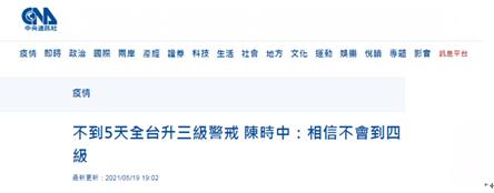 【環球網報道 記者趙友平】台灣“中央社”“聯合新聞網”消息,台灣新冠肺炎本土確診病例已經接連5天超百例,目前累計超千例,外界憂心是否離四級警戒不遠了。對此,台灣流行疫情指揮中心指揮官陳時中稱,目前尚無升第四級必要,“不希望升到第四級,我也相信不會到那裏。”