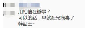 有網友諷刺陳時中是大話王:“用相信在辦事?可以的話,早就殺光病毒了,幹話王。”↓