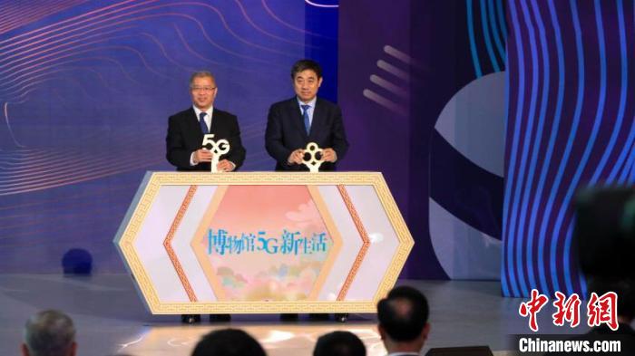 國家文物局副局長關強(右)、中國移動副總經理簡勤(左)18日日在北京開啓“博物館5G新生活”。 中國移動咪咕供圖