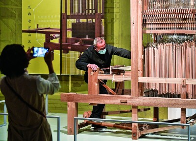 5月18日,來自中國絲綢博物館的工作人員在展覽現場使用成都老官山漢墓出土的提花機復原品展示漢代織造技藝。