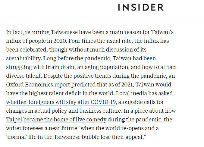 另外,這位作者還指出,雖然台灣在去年的疫情中看起來是個“天堂”,但實際上去年來台灣定居的人並不多,主要以從其他地方迴流台灣的台灣人為主。但這仍然掩蓋不了台灣的人才流失,人口老化,無法留住人才等一系列的社會問題。這位作者還很擔心一旦疫情過去,不少人就會離開台灣前往更有發展前景的地方去。