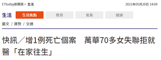 【環球網報道 見習記者 康博浩】據台灣“ETtoday新聞雲”20日報道,台灣本土疫情大爆發,過去9天累積1291例確診,20日又有一名近日確診病例死亡,為案號2683的70多歲女性,在台北萬華工作,5月15日曾出現虛弱無力倦怠拒絕就醫,5月16日被匡列為須採檢接觸者,5月17日家屬前往探視,發現已無生命跡象,家屬無症狀在居家隔離。