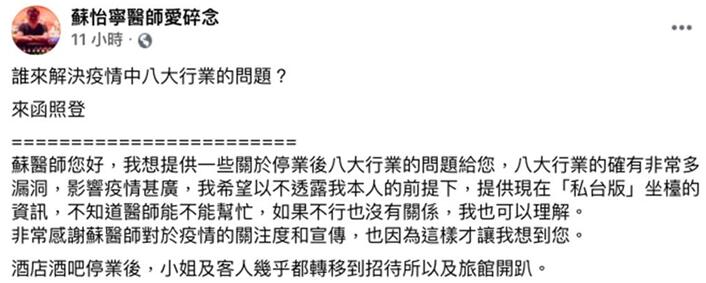 根據蘇怡寧該則臉書貼文,有網友傳遞透露,稱許多八大行業的業者,17日酒店、酒吧依規定停業後私下動作不斷,頻頻發出徵召信息,地點遍佈板橋、台中、桃園中壢、基隆、高雄等,其中不乏疫情熱區,信息中還提醒小姐記得戴口罩防疫。