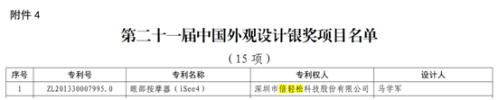 值得注意的是,這不是倍輕鬆第一次入圍中國專利獎。早在2020年公佈的第二十一屆中國專利獎中,倍輕鬆“眼部按摩器(iSee4)”就榮獲“第二十一屆中國外觀設計銀獎”。