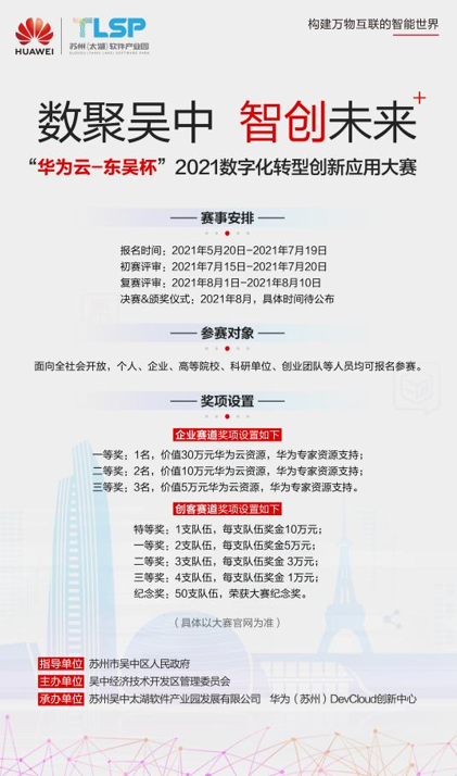 在國家大力支持下,在技術創新驅動下,華為憑藉在雲計算領域的長期積累與耕耘,已經獲得堅實基礎。2018年10月,蘇州市吳中區人民政府與華為公司簽署戰略合作協議,2019年5月,雙方在原有基礎上進一步深化合作,成立華為(蘇州)DevCloud創新中心並落地吳中經濟技術開發區,圍繞工業互聯網建設、人才培養、生態構建、樣板點打造、產業園區建設等方面將進行全方位合作,進一步推進蘇州蘇州軟件名城和智造名城建設。為了進一步加快吳中數字化進程,使創新創業有效服務於實體經濟,推動工業智能化在行業的創新應用,提升吳中經濟技術開發區的產業影響力,吳中區人民政府指導、吳中區經濟技術開發區管理委員會聯合華為雲開展“華為雲-東吳杯”2021數字化轉型創新應用大賽,通過以賽促學、產教研結合的形式,吸引和挖掘優秀創新團隊和人才聚集吳中,增強優勢產業及人才聚集吳中。
