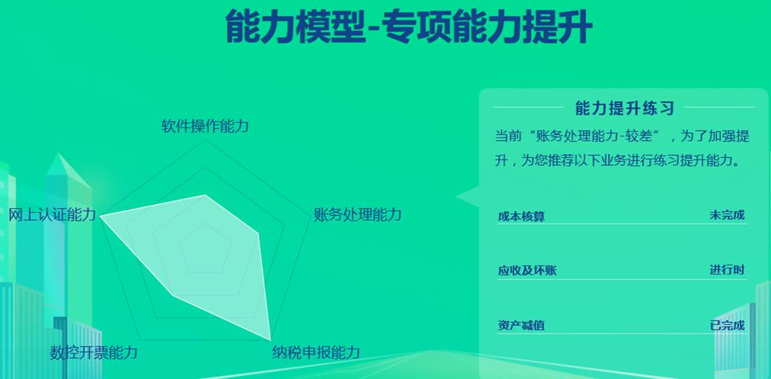 全棧會計師實訓平台每一個賬套練習後均系統都會給學員生成一個能力模型,將學員在實訓過程中的軟件操作能力、賬務處理能力、網上認證能力、數控開票能力和納税申報能力五大能力量化呈現,分析學員能力掌握情況,生成實訓報告,並匹配能力提升練習。例如當學員的賬務處理能力較差,系統將會根據學員後台實操大綱薄弱點智能推送同等星度級別的業務供學員演練。