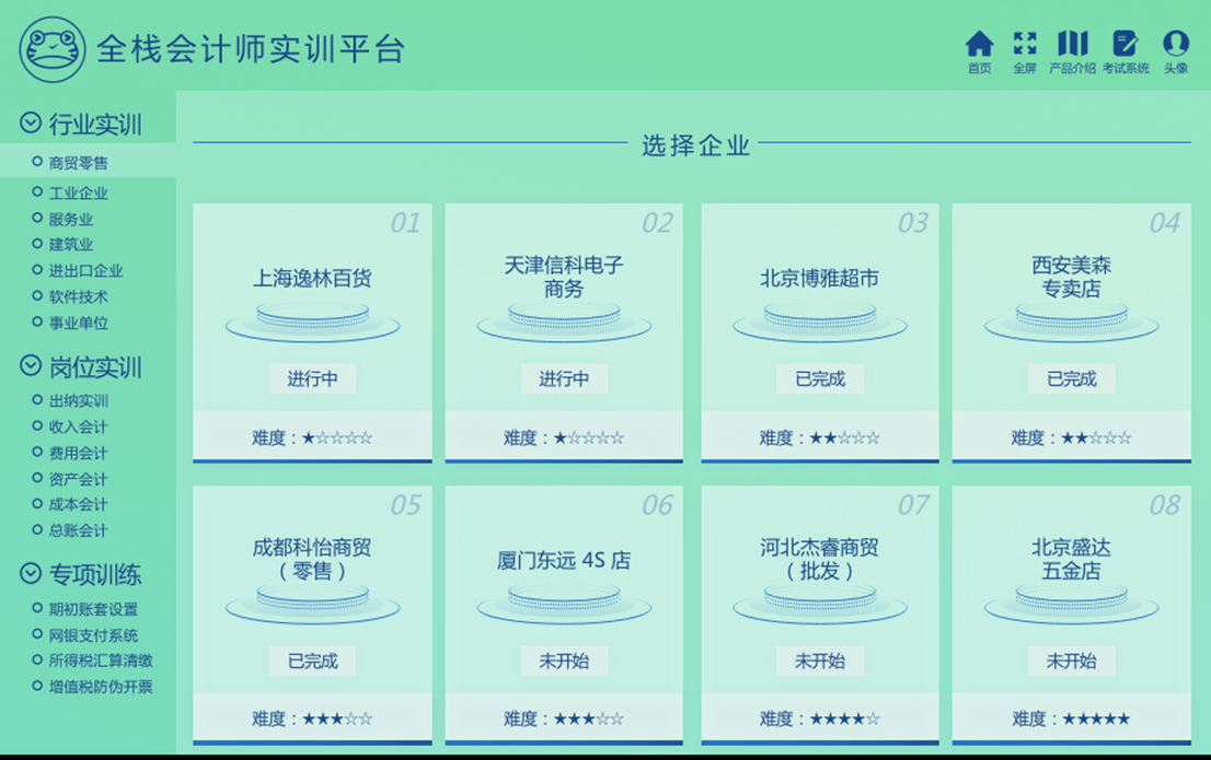 就行業實訓來説,由於每個行業具備特殊性,對會計實操技能的要求不同,對啊網全棧會計師實訓平台甄選23個熱門行業,全面滿足學員不同行業就業意向的實訓需求。學員可在平台自主選擇企業類型,亦可跨行業全面涉獵,能迅速提升學員的財務思維和賬務處理能力。每一個賬套均來自企業真實案例,全盤操作從期初賬套設置,記賬、報税的全流程處理,全仿真原始憑證,真實演練企業中的每一個業務場景。此外,對啊網全棧會計師實訓平台中每個賬套均按照難度進行設計,分為1星~5星,學員可以根據難度進行階梯式晉級。