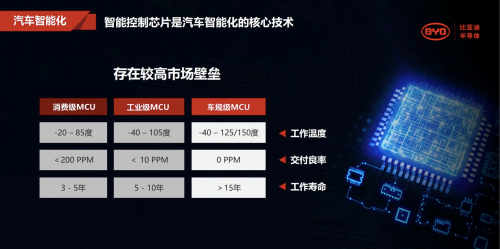 在研發與技術實力方面,比亞迪半導體MCU擁有300餘人研發團隊,完全掌握8051/32位ARM處理器設計與應用、電容傳感器技術、數字/模擬信號處理技術,嚴格遵循IATF16949標準生產管控流程。車規級MCU及電子產品品質達到AEC-Q100 Grade1標準,並且依據ISO26262標準進行設計,降低汽車電子系統層級為滿足功能安全標準的設計複雜程度,提升可靠性。車規級MCU產品現已申請328件國內外專利、201件發明專利。